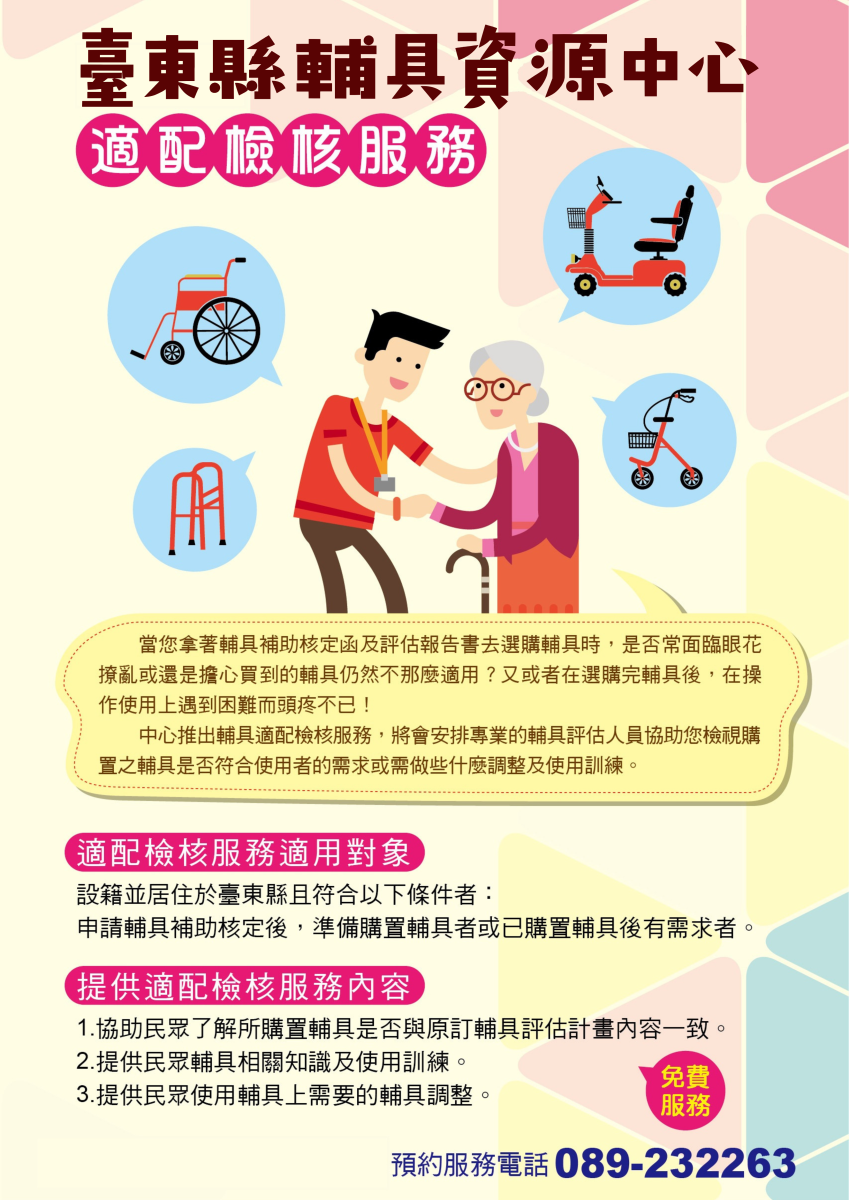 - 建議購買輔具時或購買後一個月內,聯絡輔具中心到宅檢核輔具適用與否,並協助調整以達安全使用,聯絡電話:089-232263。