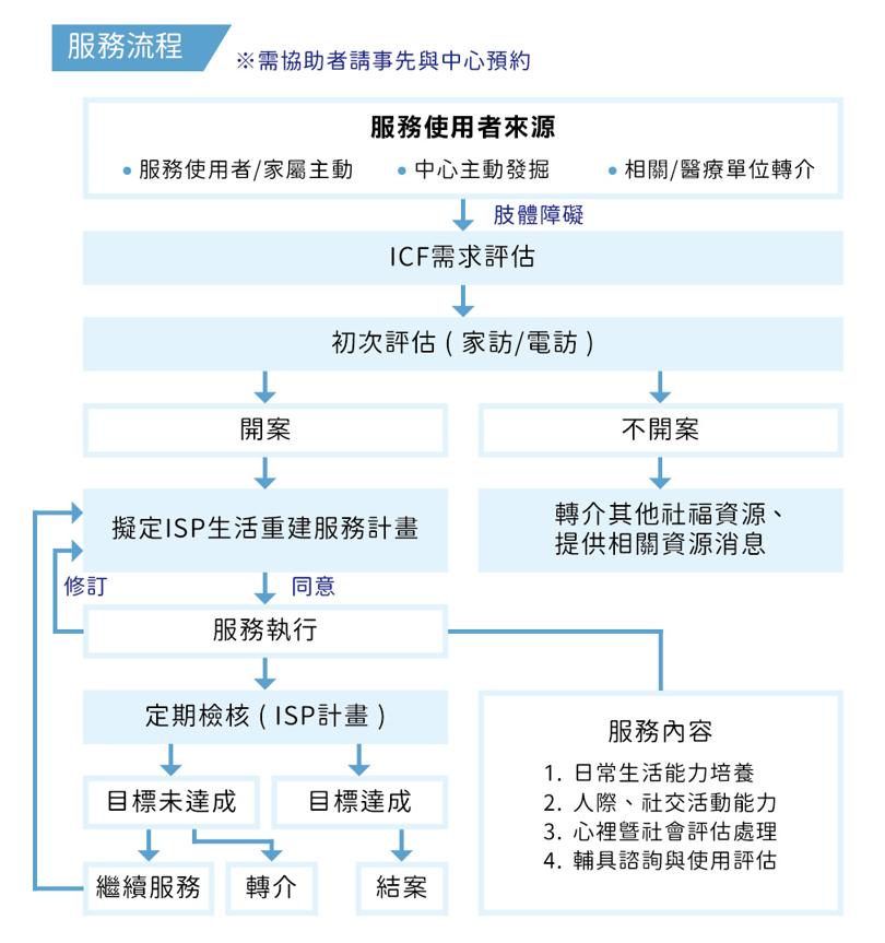 針對中途導致肢體障礙者,由專業人員於重建關鍵期,對受服務者及其家庭進行需求評估,視服務對象狀況擬定個別化服務計畫、服務期限,以重新建構其獨立生活能力。