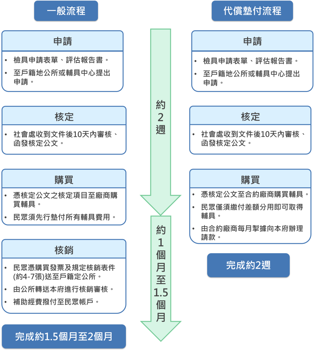 - 廠商依據核定公文向單位開立請款文件,並交付輔具予民眾。