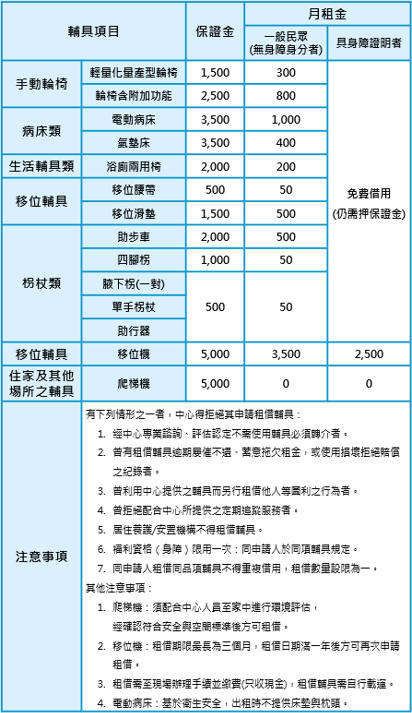 - 身心障礙者:需保證金(輔具歸還確認無異後退回),前六個月免月租金,超過六個月則以一般民眾身份收費,爬梯機與移位機除外。