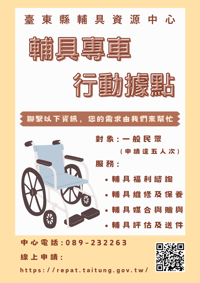 - 服務內容:輔具評估、維修、檢核、適配、使用訓練、回收、租借、媒合。